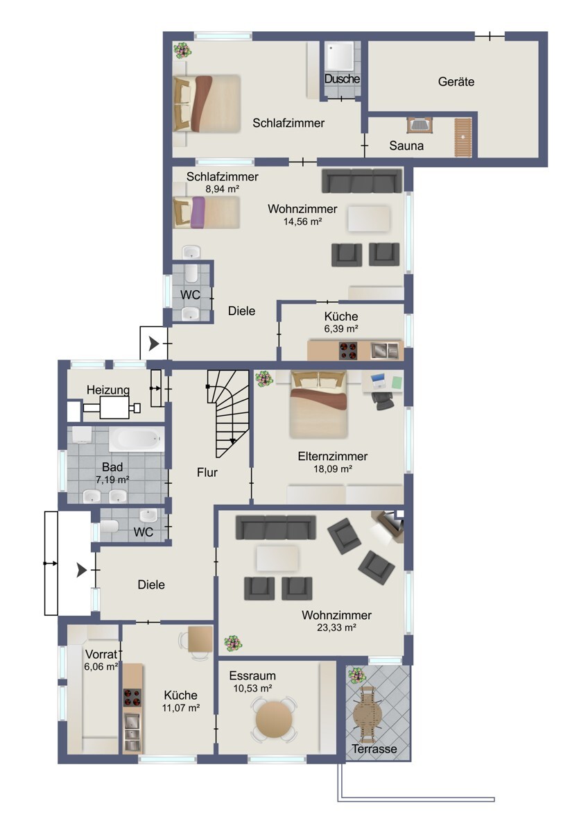 Die Gesamtwohnfläche von ca. 174 m² verteilt sich auf das Haupthaus mit ca. 116 m² sowie die Einliegerwohnung mit ca. 58,20 m². Beide Wohneinheiten sind derzeit vermietet.