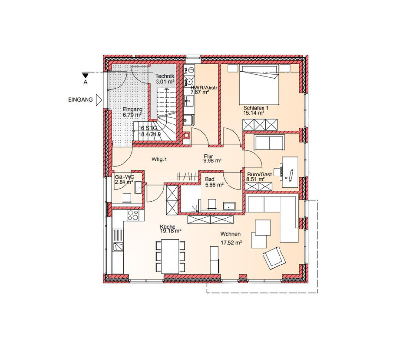 Beim Betreten der Wohnung kommt man zunächst in den Eingangsbereich, der ein praktisches Gäste-WC bietet.