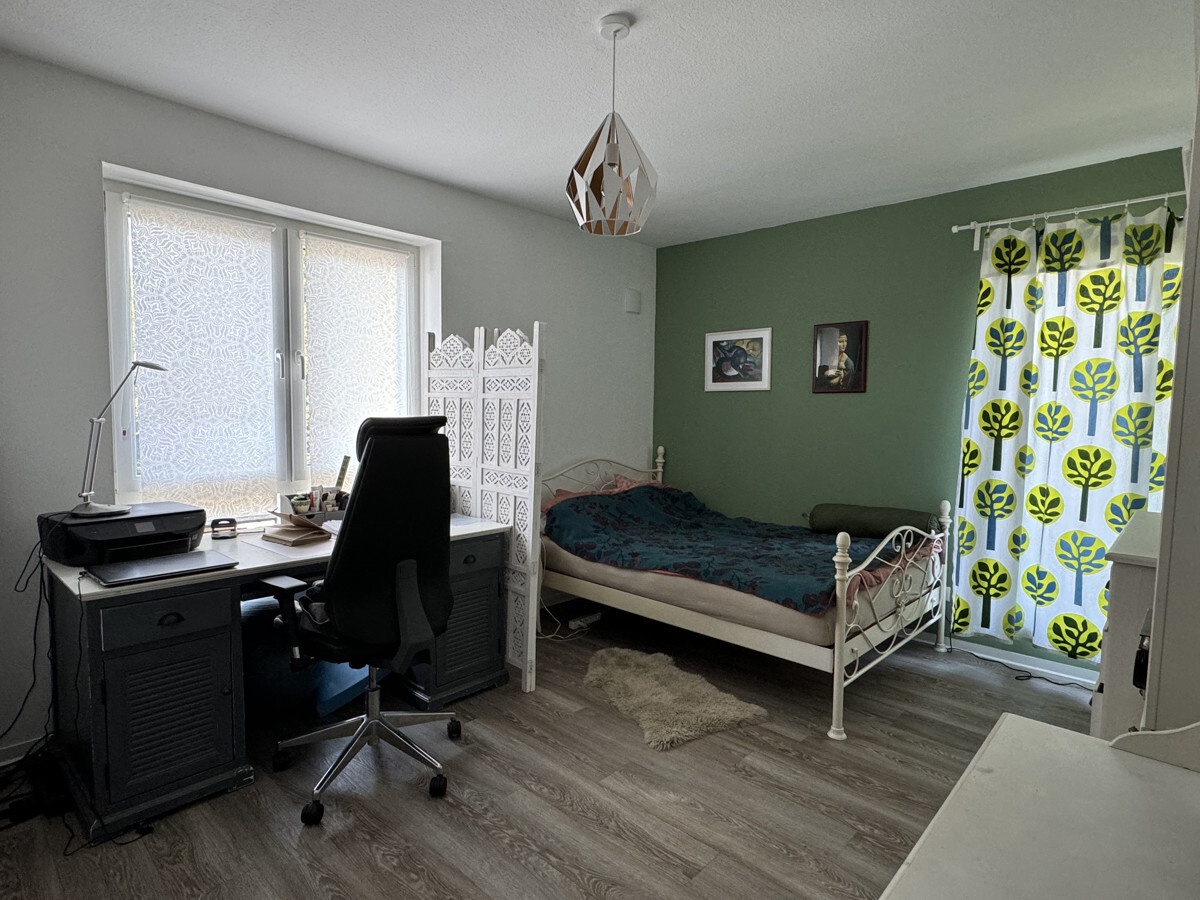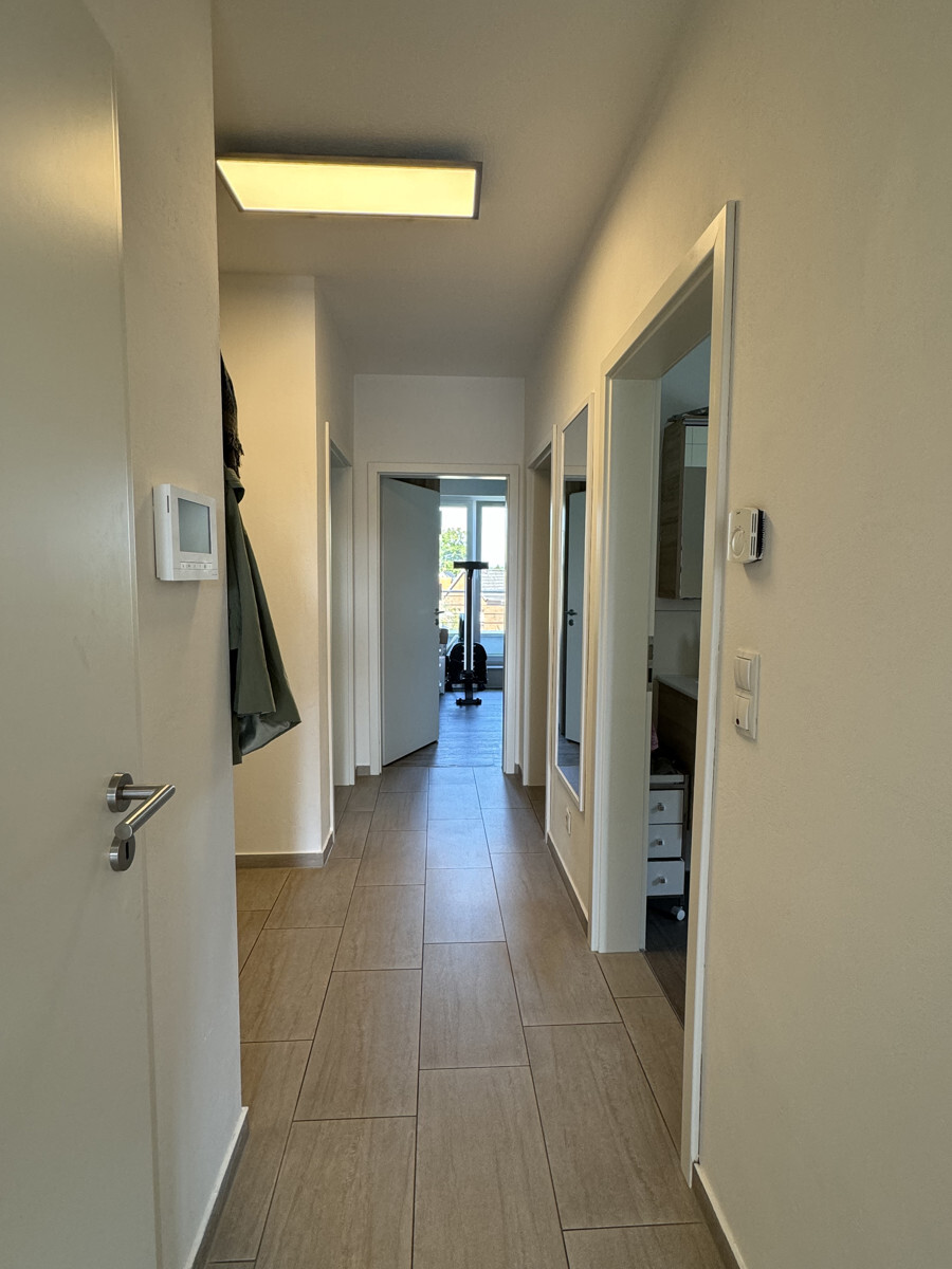 Beim Betreten der Wohnung gelangt man in einen Flur, von dem aus nach links die beiden gemütlichen Schlafzimmer liegen. Direkt daneben befinden sich ein praktischer Abstellraum sowie das Badezimmer mit einem Fenster, das für ausreichend Tageslicht sorgt.