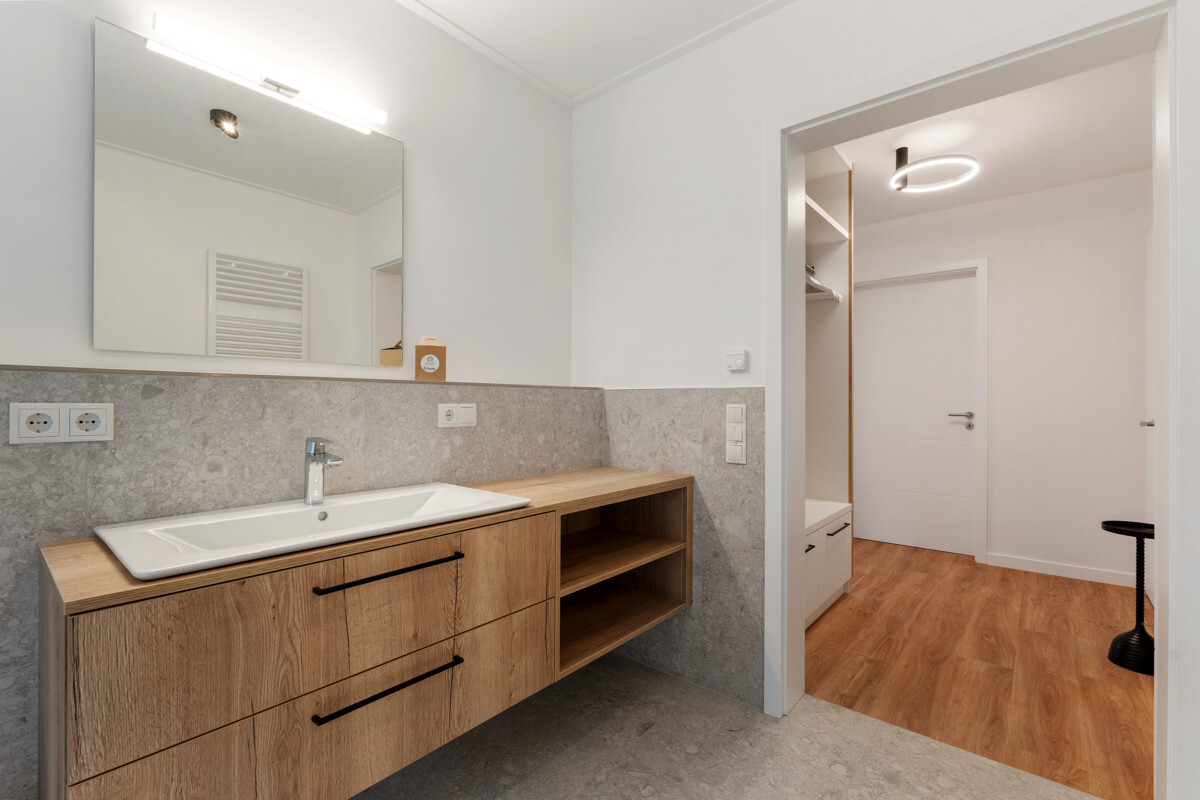 Die Wohnung ist mit Fußbodenheizung und Dreifachverglasung ausgestattet, was für ein angenehmes Wohnklima sorgt. Der helle Vinylboden unterstreicht das moderne Ambiente. Besonders praktisch ist der separate Abstellraum mit Waschmaschinenanschluss, der zusätzlichen Stauraum und Komfort bietet.
