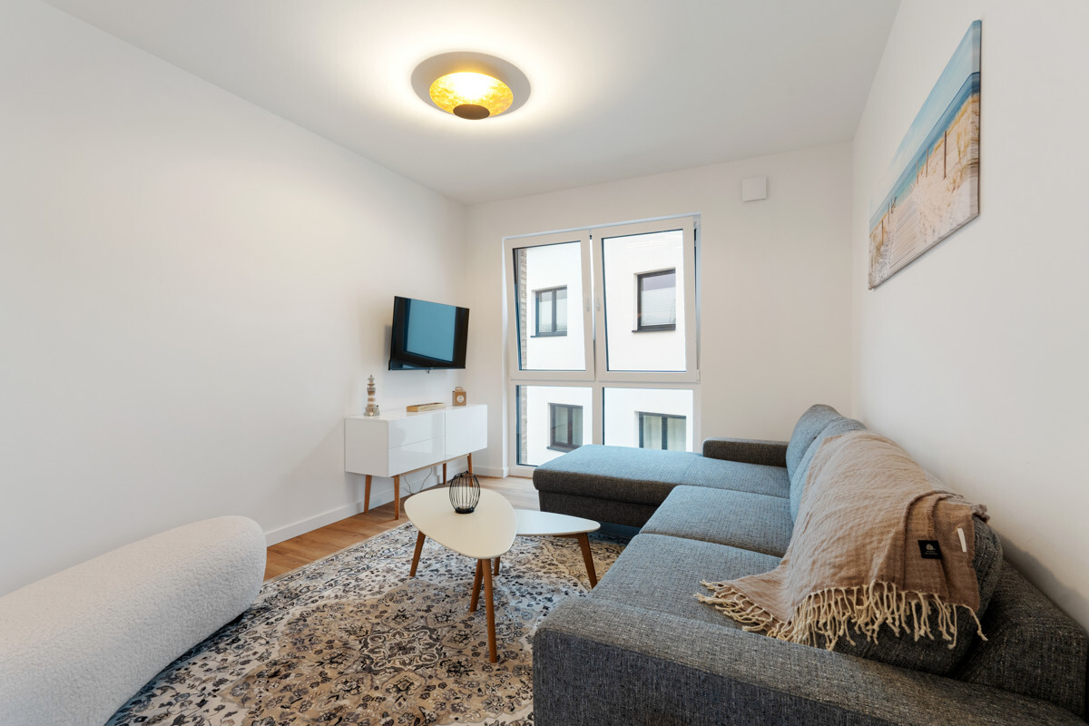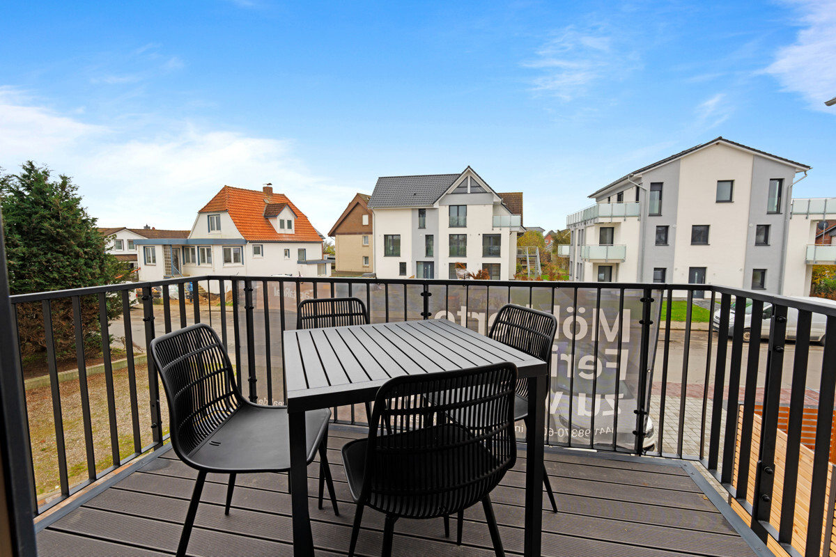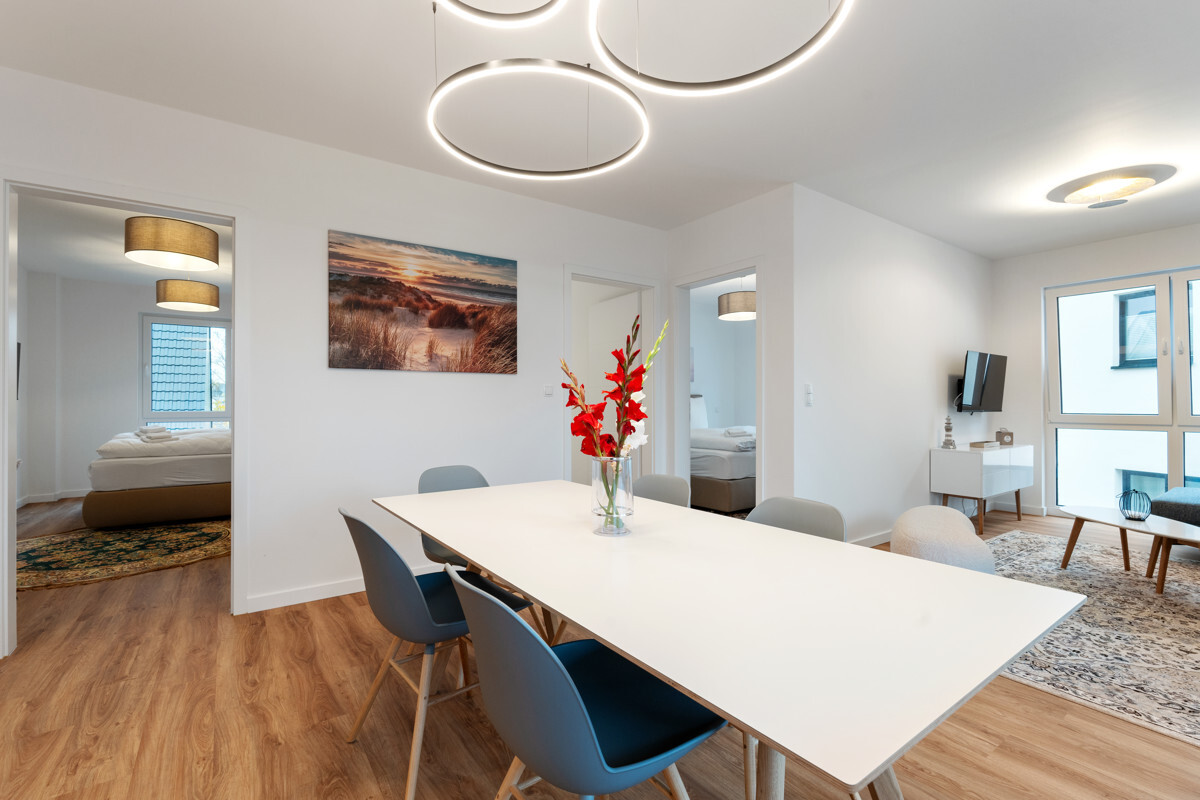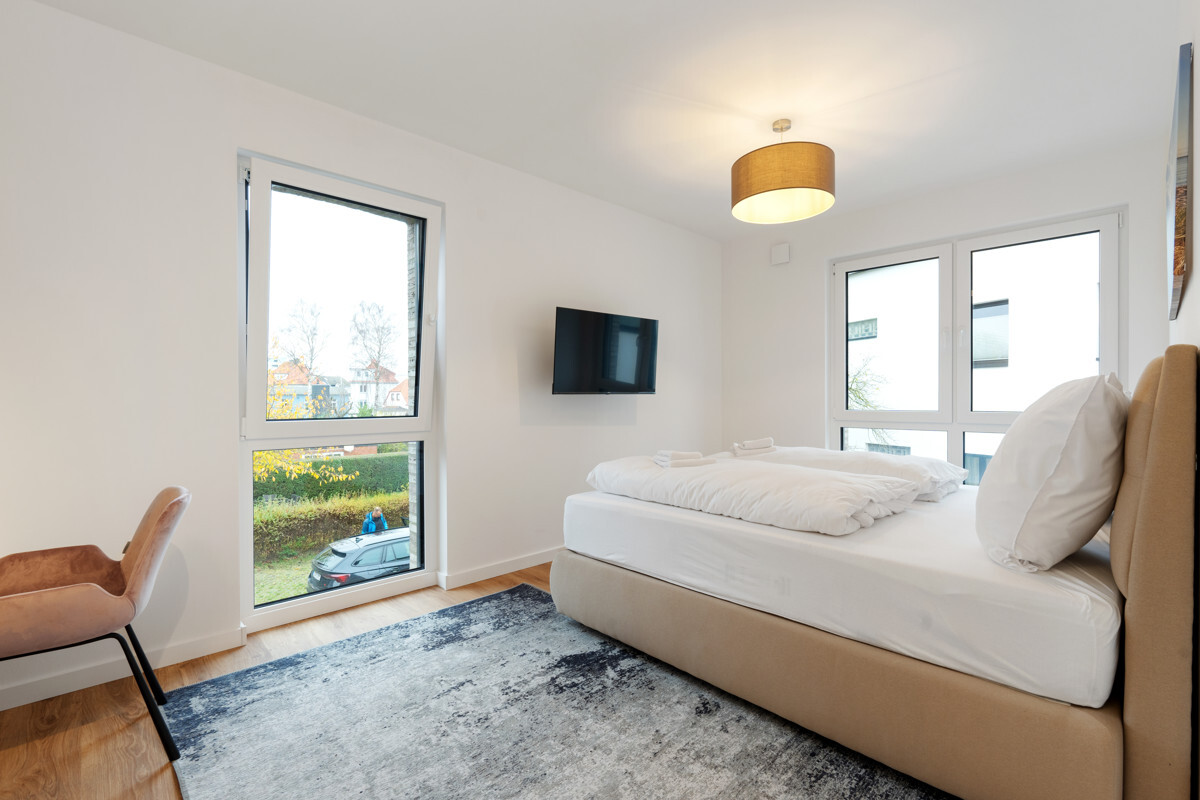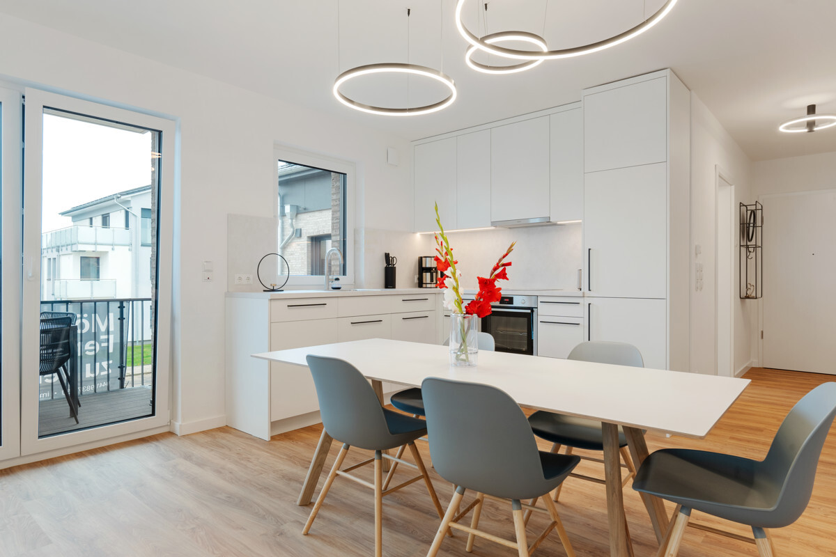 Dank der bodentiefen Fenster ist die Wohnung besonders hell und lichtdurchflutet. Der Balkon bietet einen schönen Ort zum Entspannen und rundet das Urlaubsfeeling ab. Im gesamten Gebäude sind die Wohnungen barrierefrei gestaltet, inklusive einer bodentiefen Dusche im Badezimmer und breiten Fluren, die ein offenes und großzügiges Raumgefühl vermitteln.