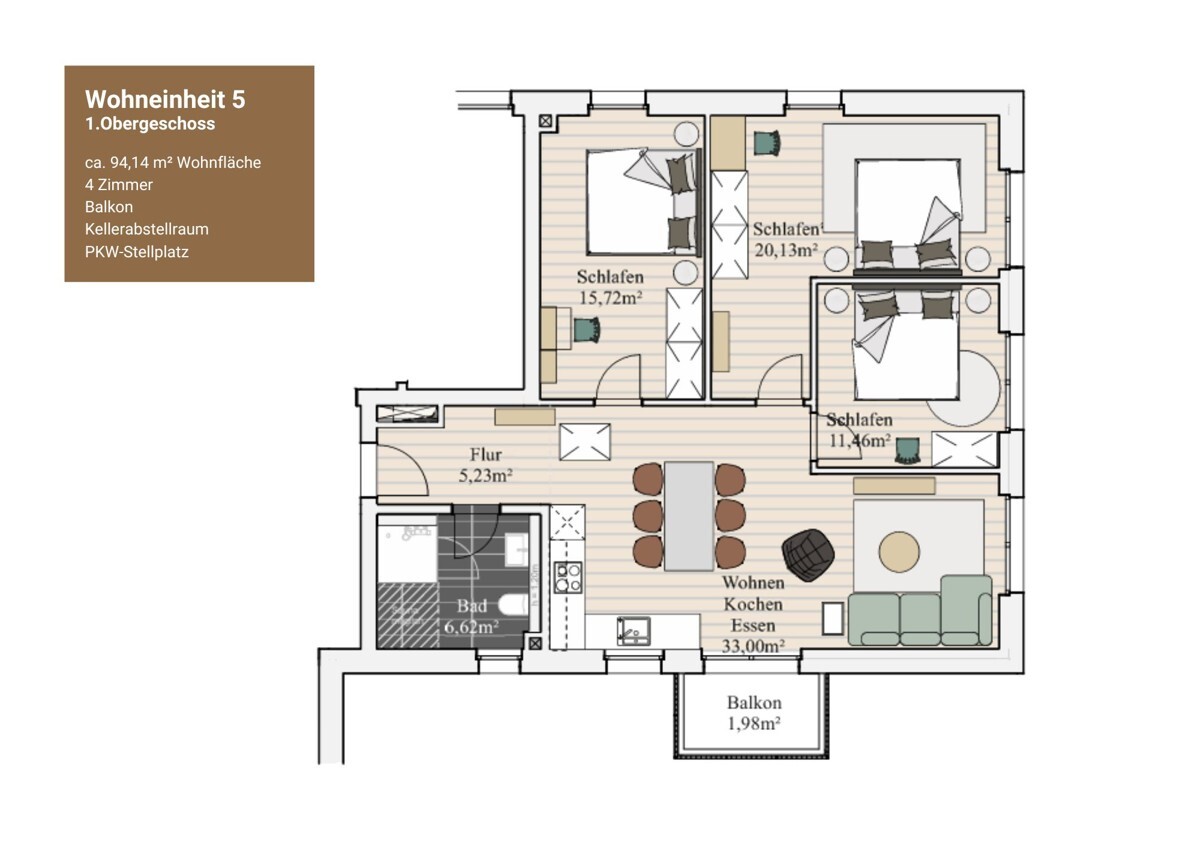 Diese großzügige 4-Zimmer-Wohnung im 1. Obergeschoss bietet auf 94 m² eine ideale Kombination aus Komfort, Helligkeit und moderner Ausstattung. Die Wohnung verfügt über drei geräumige Schlafzimmer, einen großen, offenen Wohn-, Koch- und Essbereich sowie ein stilvolles Badezimmer. Eines der Highlights ist die im Badezimmer integrierte Sauna, die für eine besondere Wohlfühlatmosphäre sorgt.
