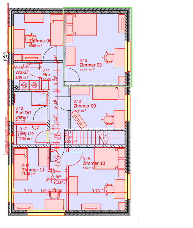 Das Studentenwohnhaus besteht aus insgesamt 9 Zimmern, die komplett möbliert sind und sich auf zwei Etagen aufteilen.